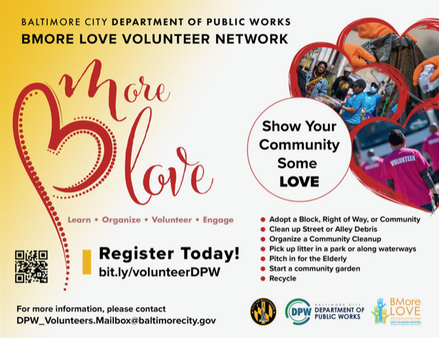 DPW Survey - The Office of Equity and Environmental Justice within the Department of Public Works is currently disseminating the Environmental Resource Access Survey; we hope that these questions will serve as a tool to explain what Baltimore residents experience across the city, and demonstrate whether existing resources are accessible and widely known. This will help us establish how to improve access to programs, education, and resources, and shed light on what services are missing. We want to know what is working well for all residents, and how, together, we can make improvements! Please follow the link below to the survey